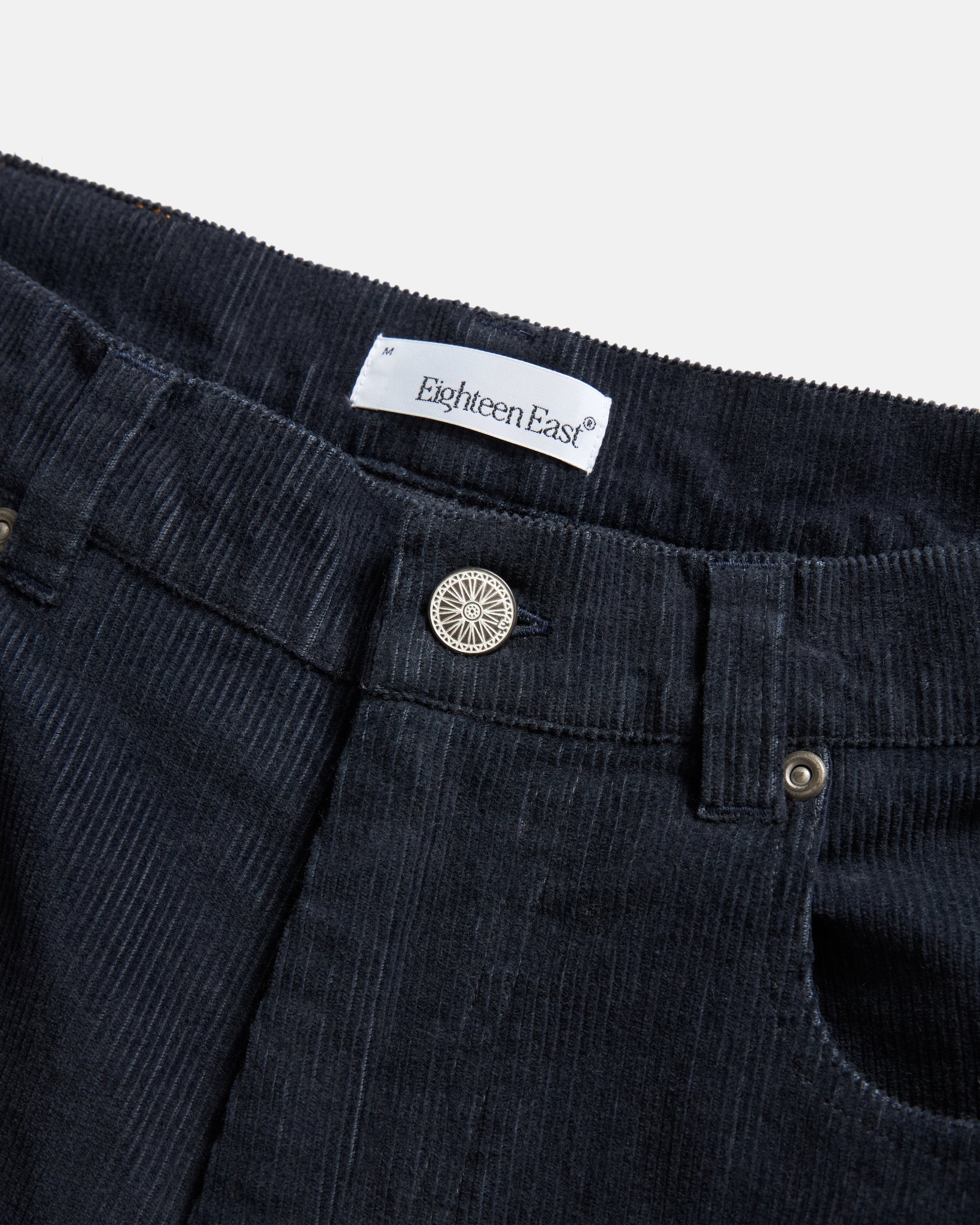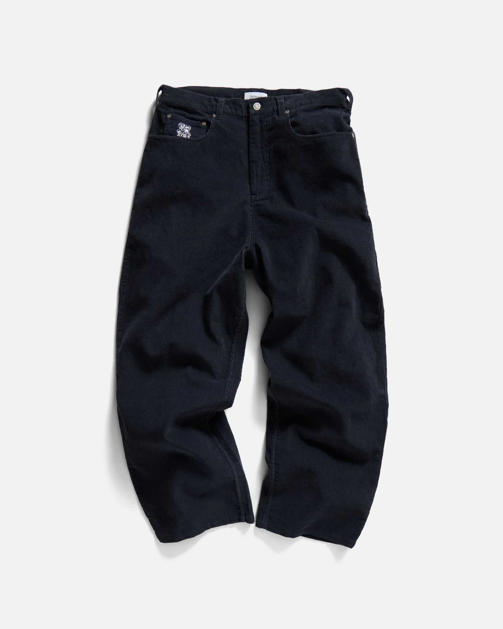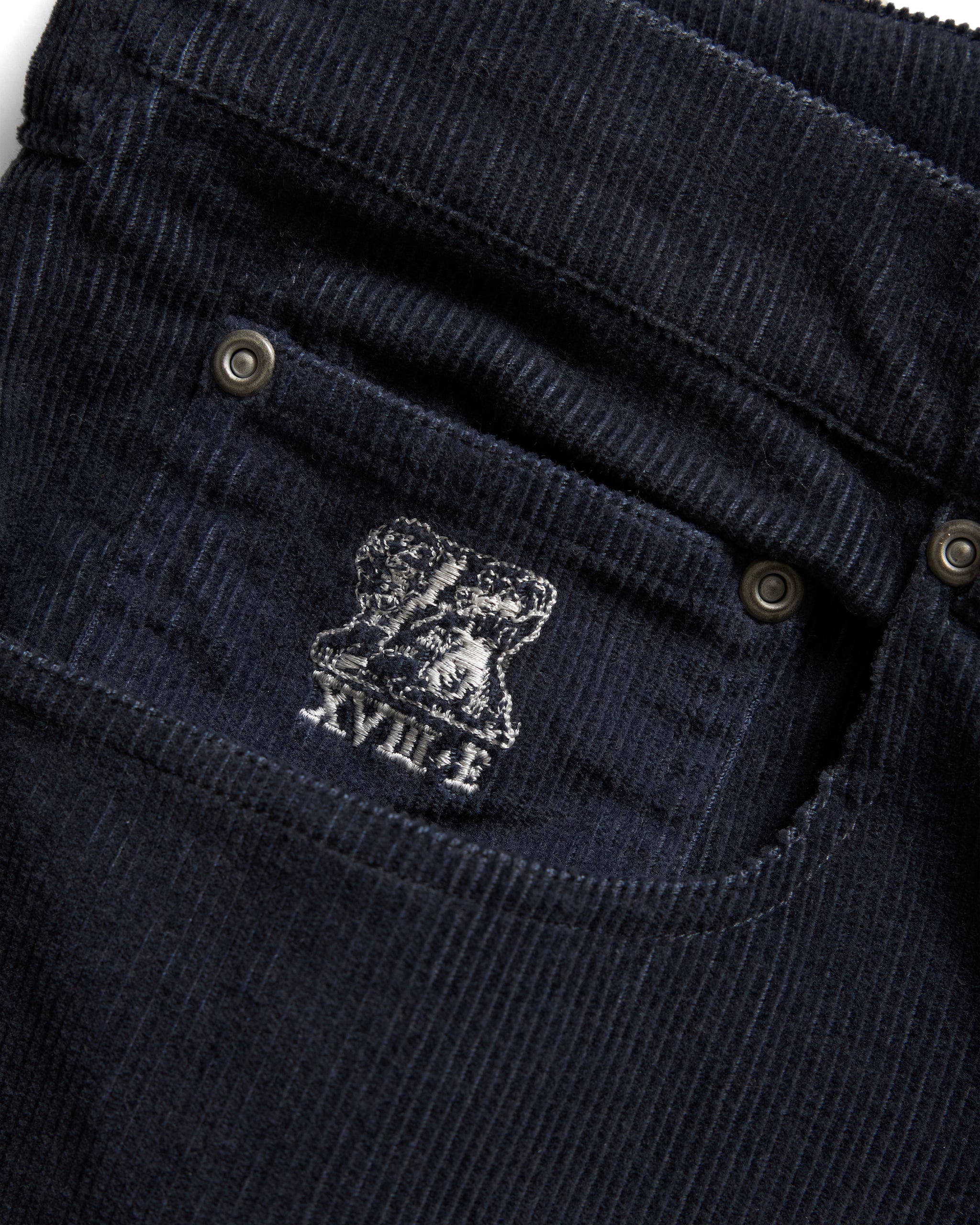 “Our Matteo 5 pocket cut in corduroy for the colder months ahead. These are roomy through the thigh with a slight taper below the knee to the hem. They feature a hand-block printed Khadi cotton back patch with signature "archway" back pocket stitching, aged nickel rivets at stress points and a Palombini lion embroidery at the front coin pocket because this was incredible.” - The Management
