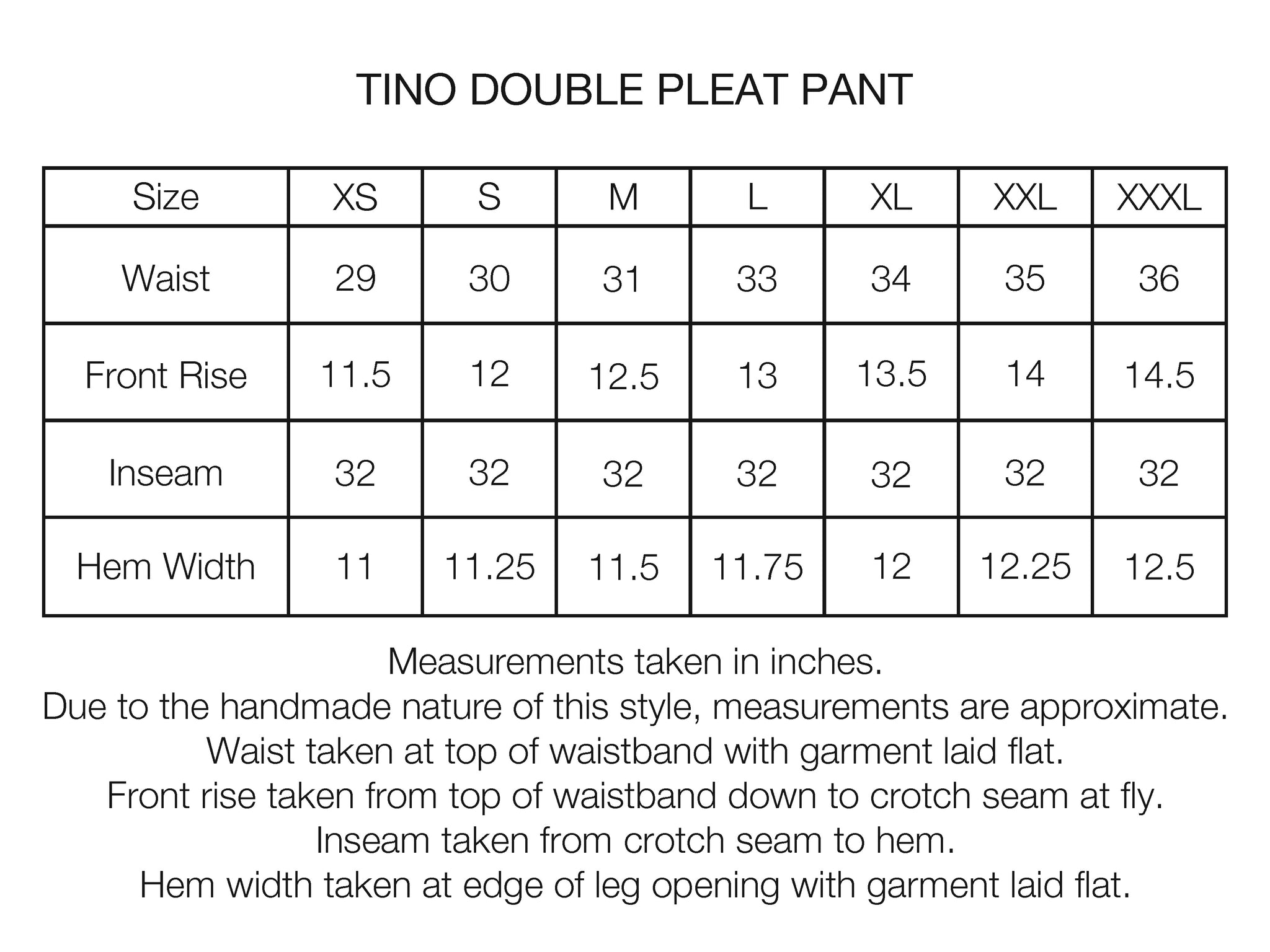 For those looking for a wide leg pant with zero taper, we are proud to introduce you to your new favorite trouser.  The Tino fits clean through the top block with deep double reverse pleats and a full cut leg all the way to the hem.  It features 1/4 top pockets, two besom back pockets and a zip fly.