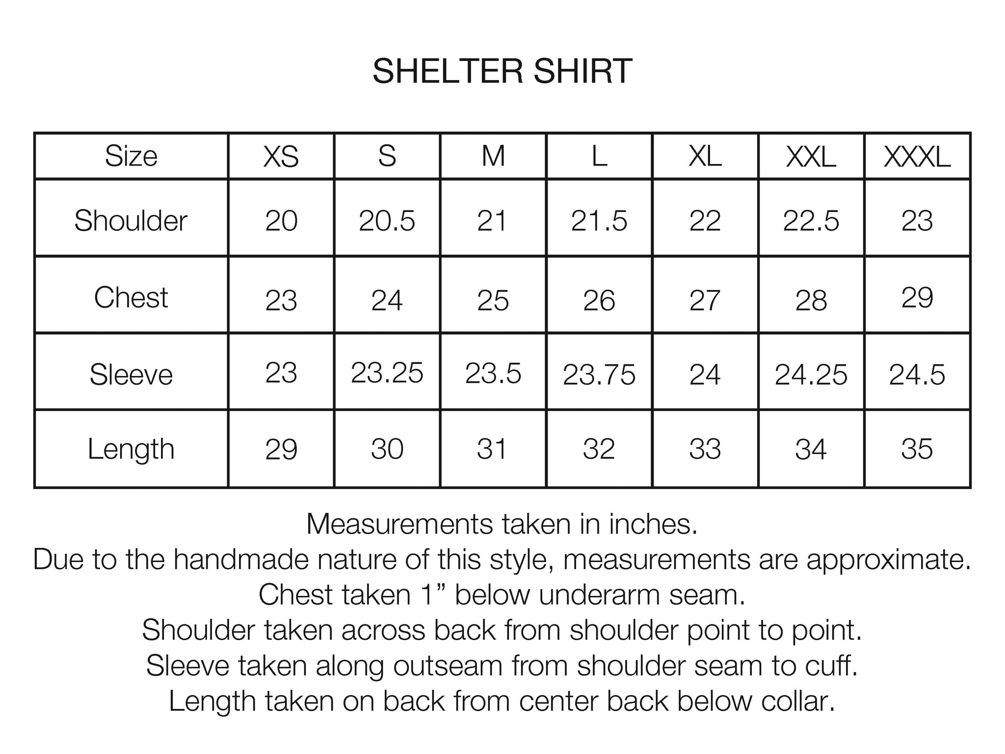 Blending details of the iconic 1940s khaki service uniform shirt with our ever-popular Shelter pants, we are proud to introduce the Shelter shirt.  Cut from a substantial cotton twill, the Shelter shirt features a relaxed fit through the body and slightly cropped length.  Other features include two oversized, flapped patch chest pockets, a soft point collar and tonal cotton herringbone tape binding reinforcements at the hem, cuff and interior behind the chest pockets.
