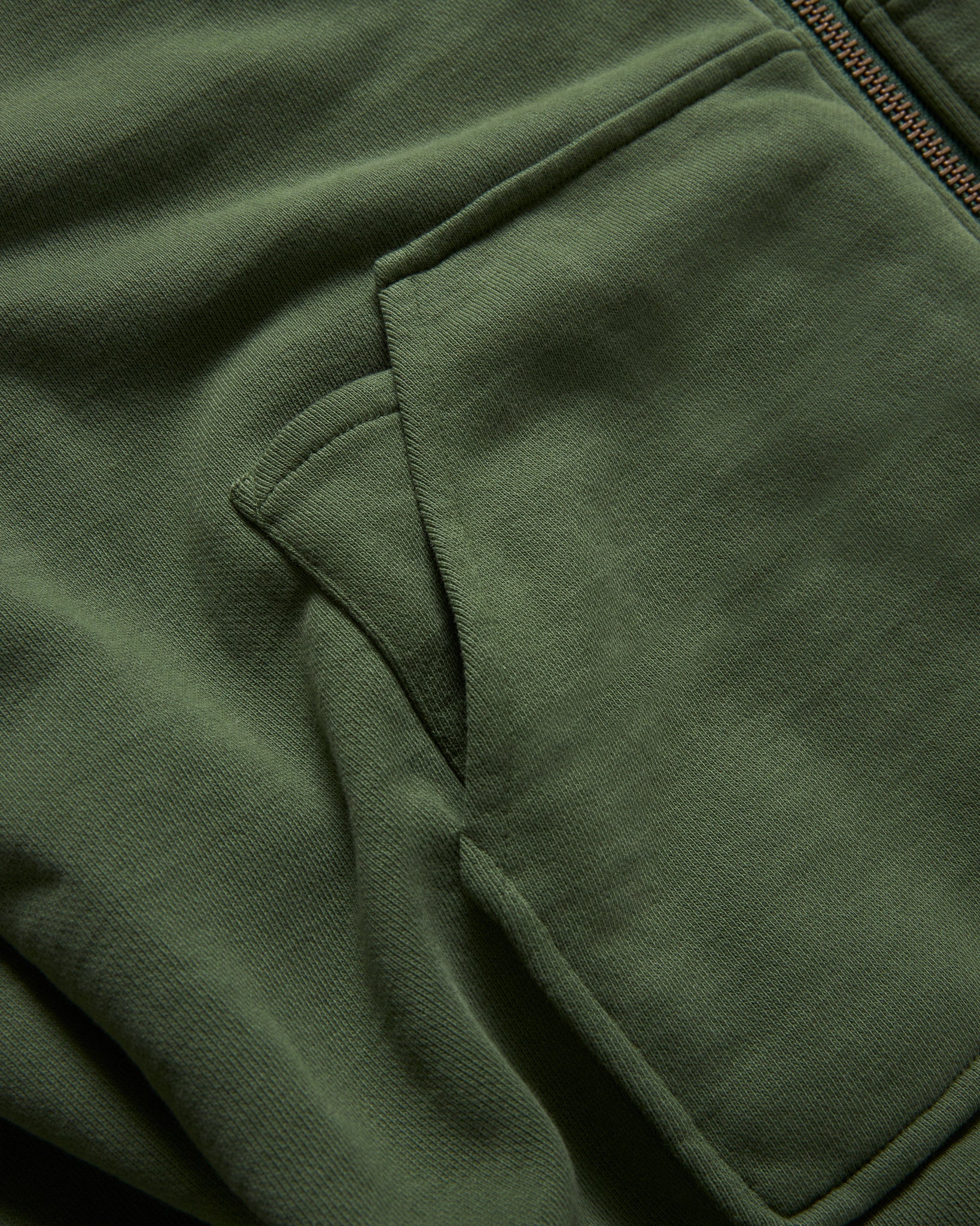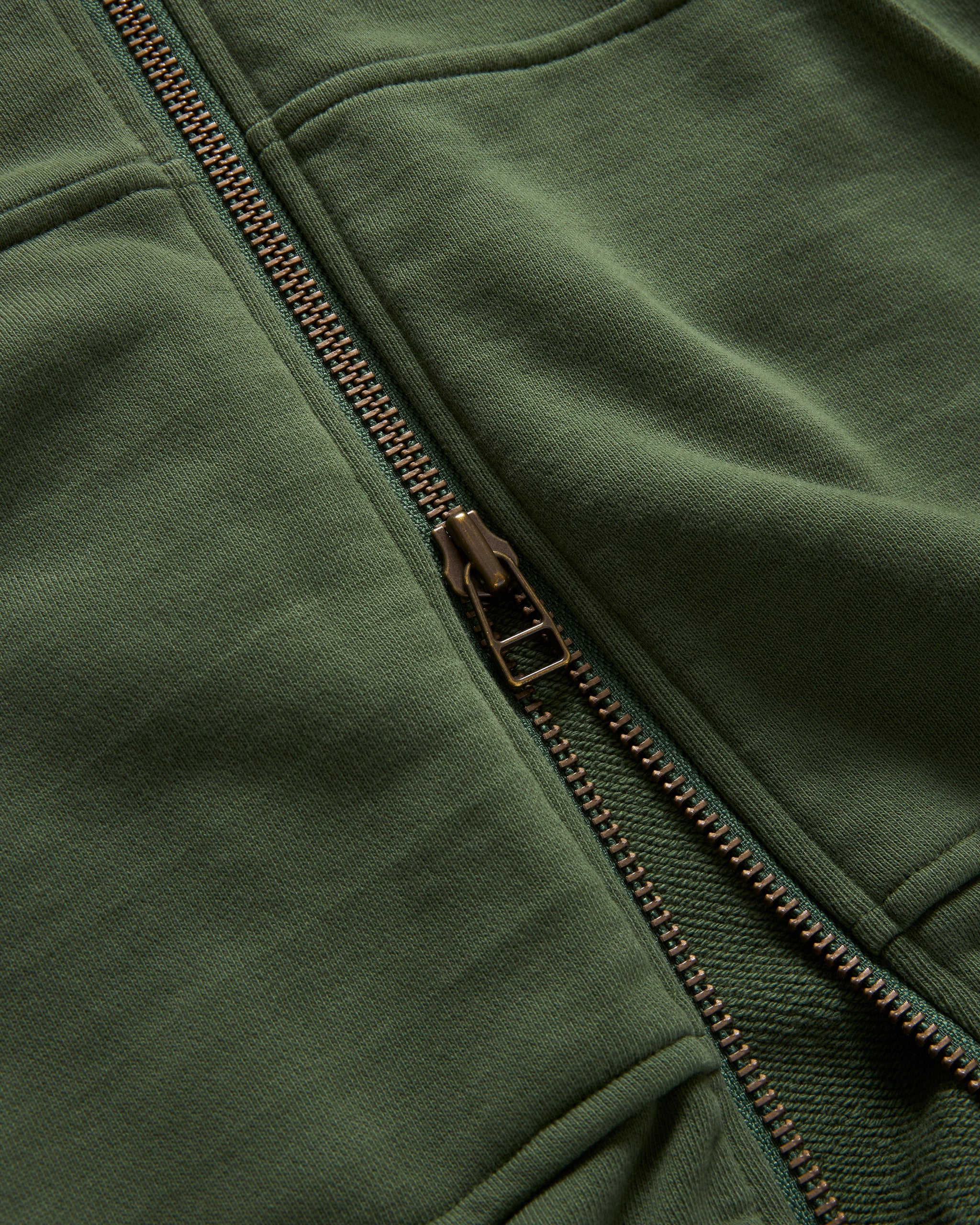 From a fabric and silhouette perspective, our Tolmie sweatshirt has more in common with heavy-duty duck canvas workwear jackets than the flimsy, poly-blend blanks that most people think of when they imagine a full-zip.  Cut from a substantial 19 oz. all-cotton fleece, it features a two-way, 8g antique brass zipper, generous double-lined hood and set-in stash pocket behind the main kangaroo at the front.