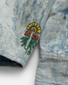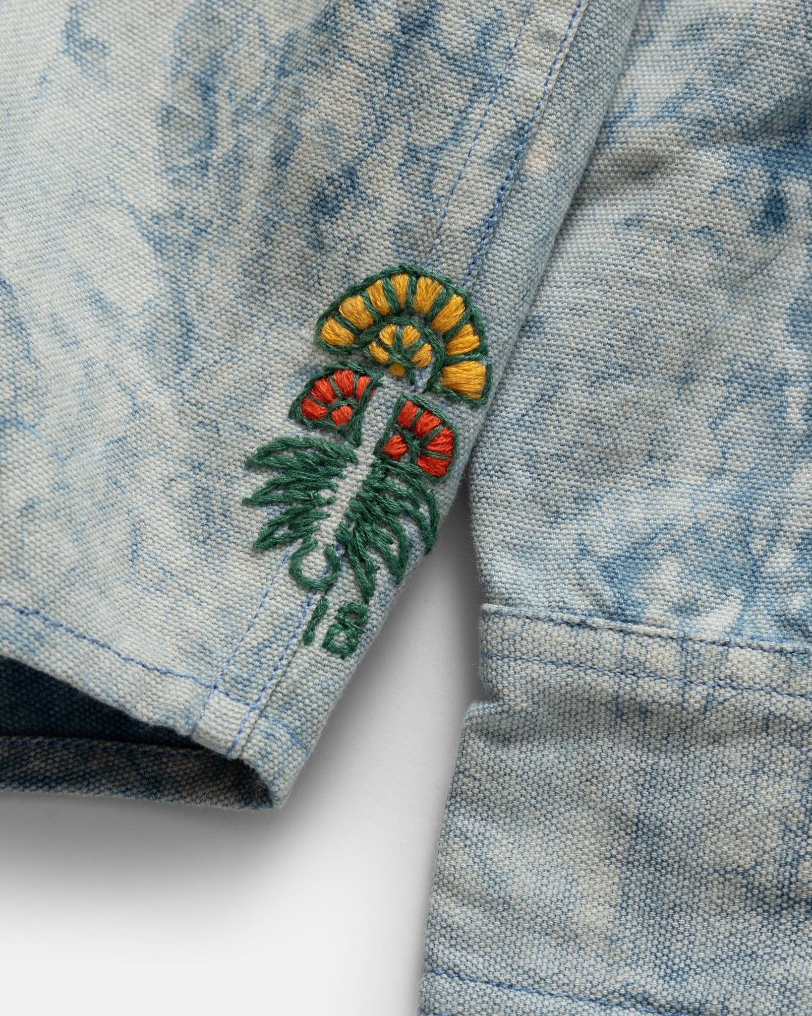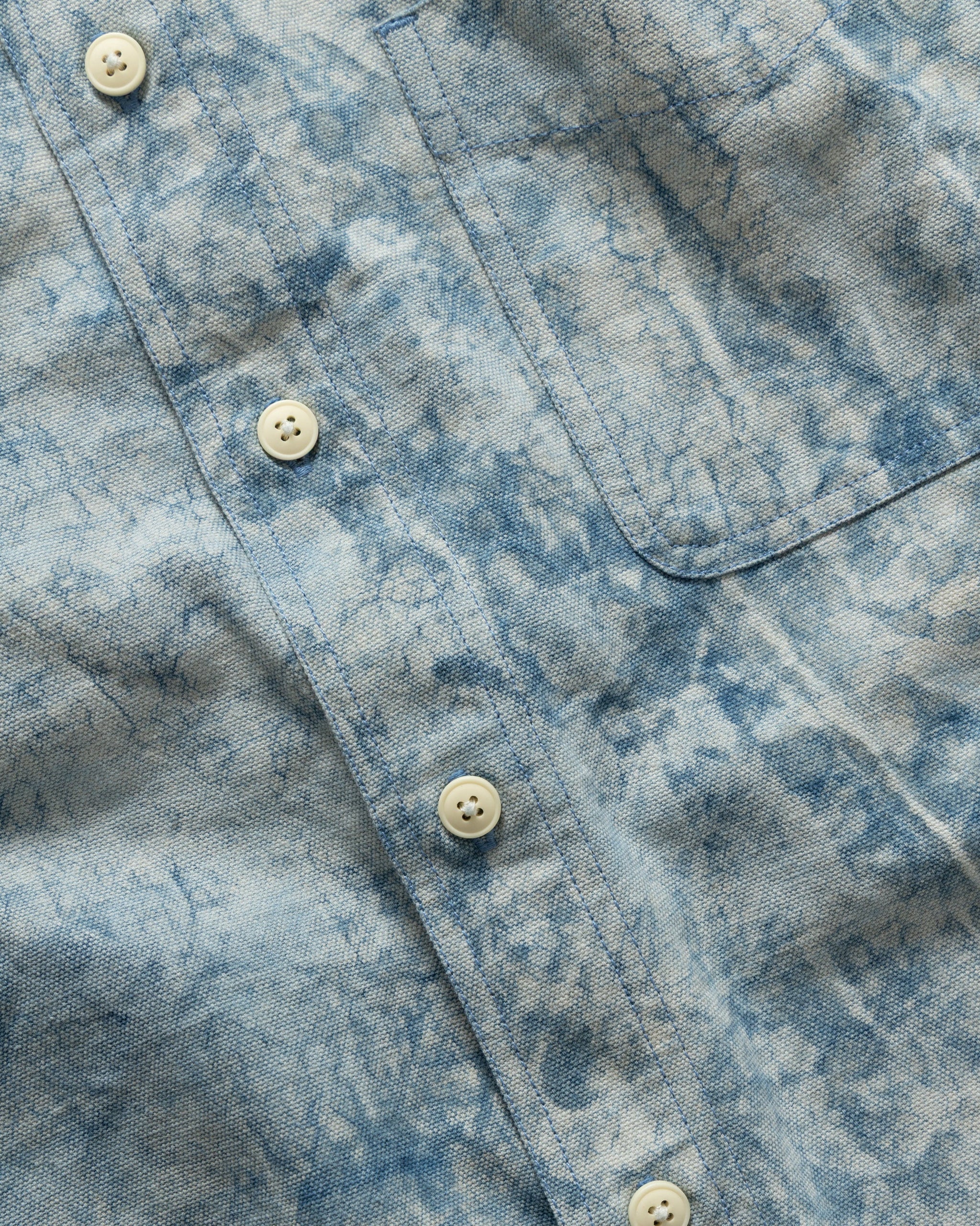 The gutsiest Oxford we could find, dyed in the traditional Dabu method. That means this was fully painted in mud, dried, cracked then hand dyed. An exceptionally irregular process for an iconic shirt. Finished off with a hand embroidered Indian "Bhuti" flower at the left side seam, to show that we make these pieces overseas for craft and beauty's sake.