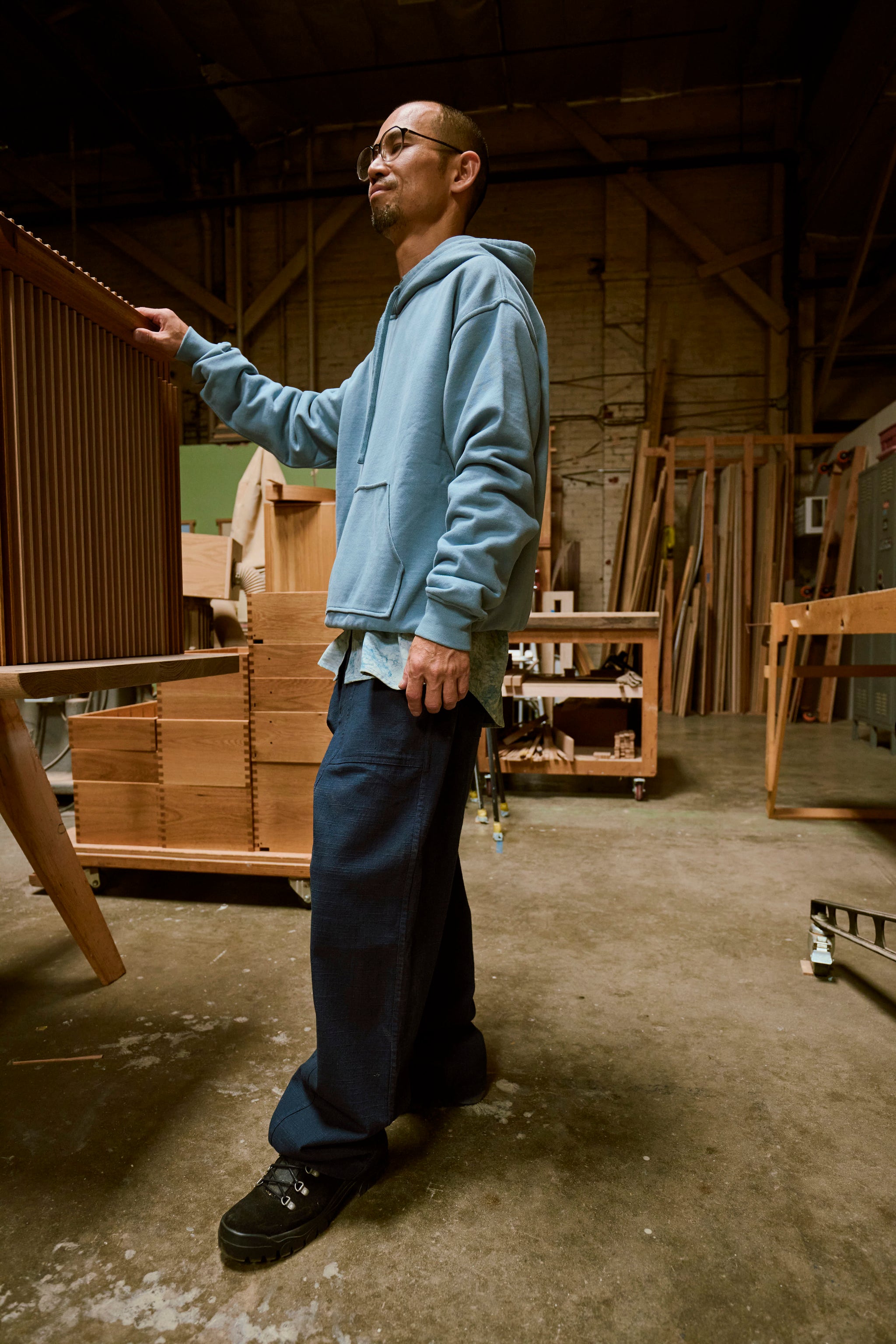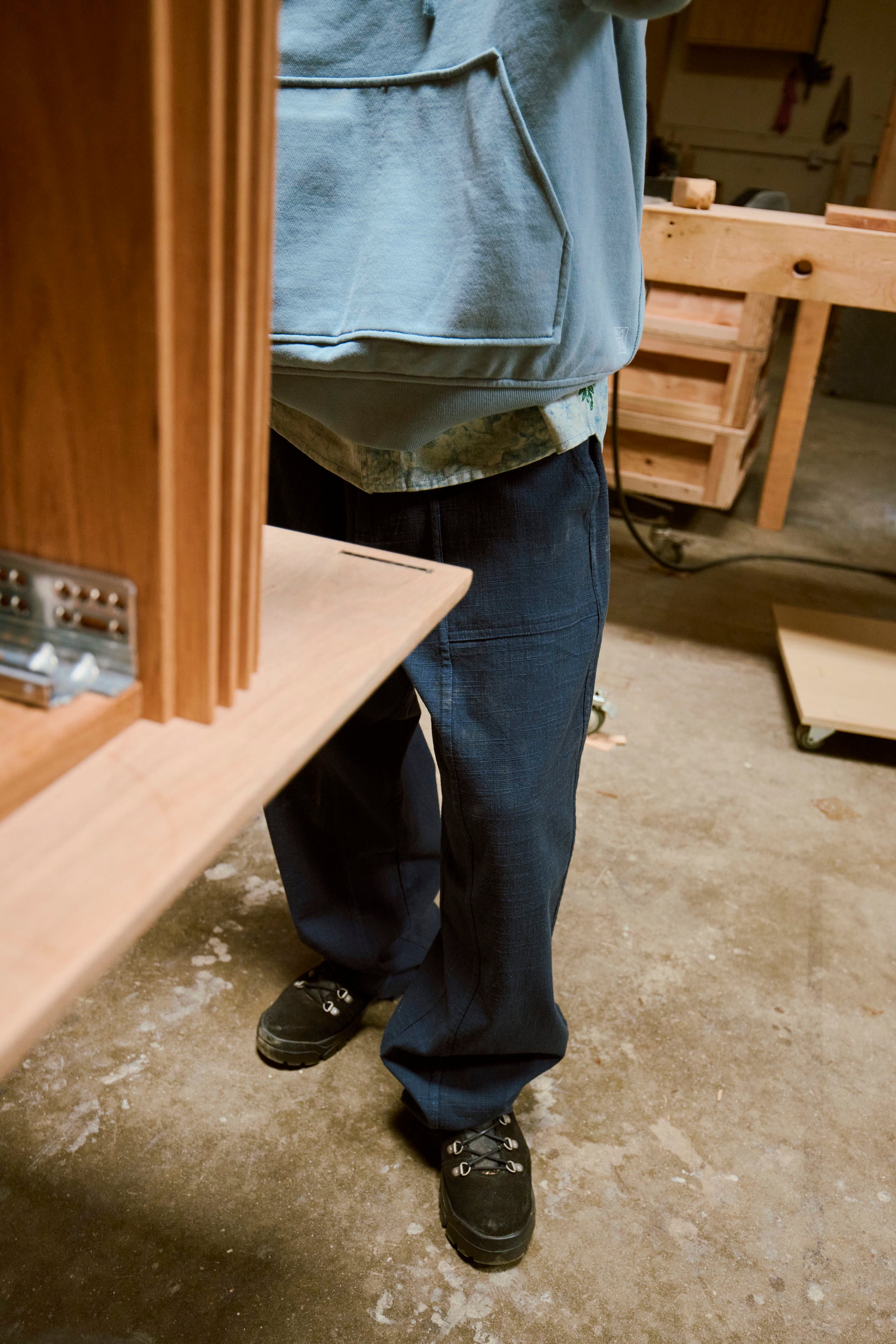 An updated Baker pant designed to be functional with or without a belt (The waistband has an internal drawcord and elastic at the back but a clean front).