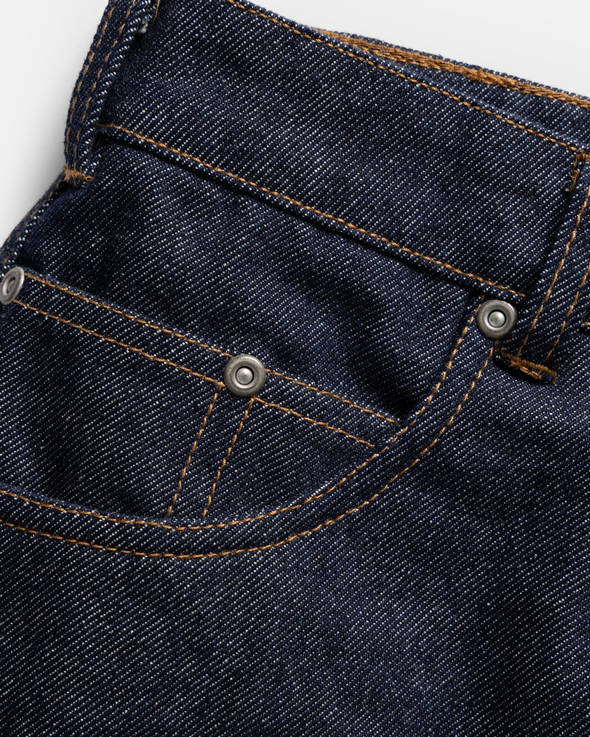 Named for Boston’s own Ben Tenner, the Tenner jean is cut on the same fit block as our double knee but with more traditional denim detailing. It features a hand block printed Khadi cotton back patch, signature "archway" back pocket stitching and a new “Reem” split double coin pocket at the wearer’s right hip.
