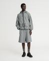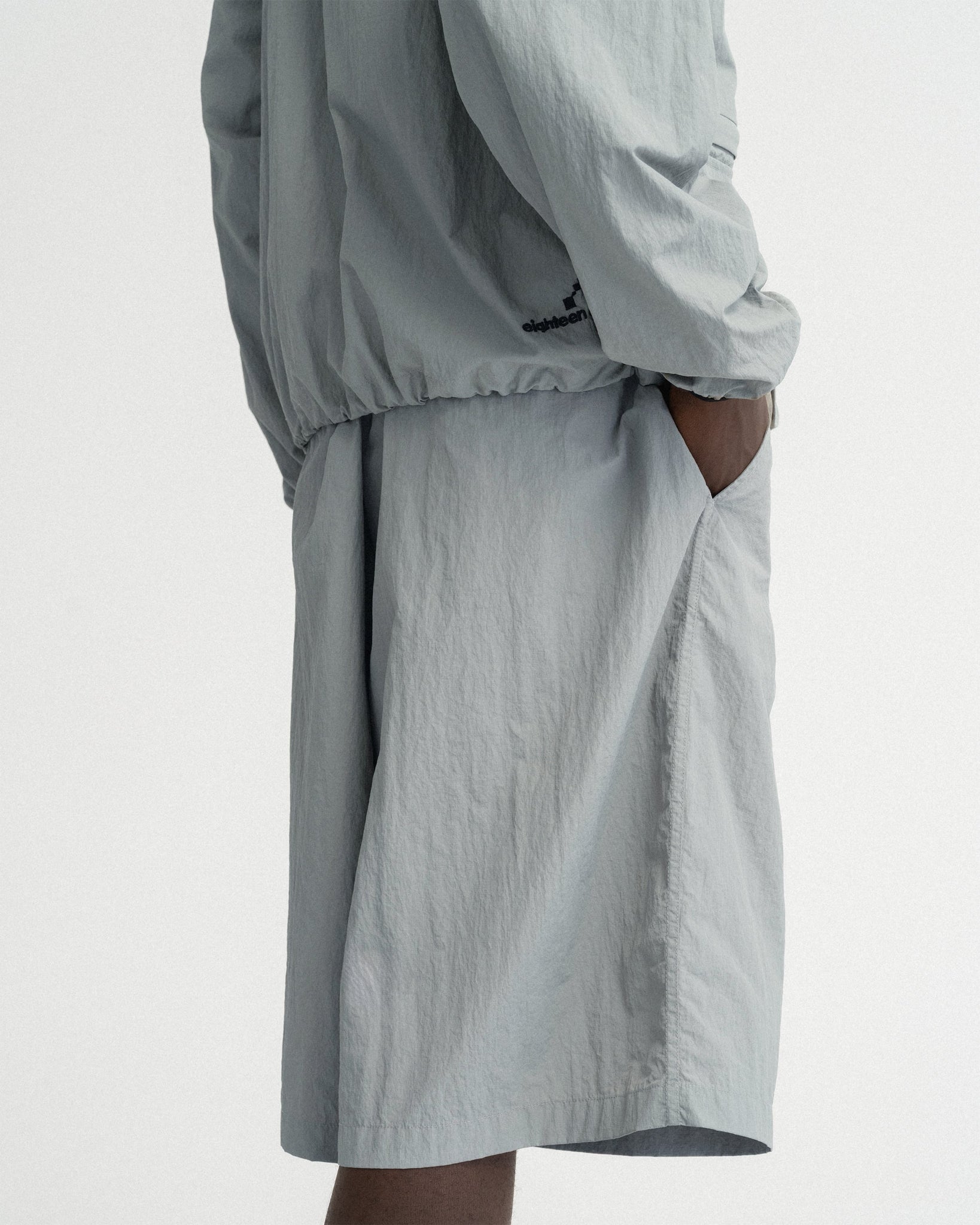 The Emery has all the ease of elasticized waistband nylon shorts, crossed with the formality of an oversized pleated trouser. It features a longer, oversized silhouette with single pleats with a partially hidden coin pocket, an elasticized half waistband with beltloops and a clean hook and eye closure at the center front.