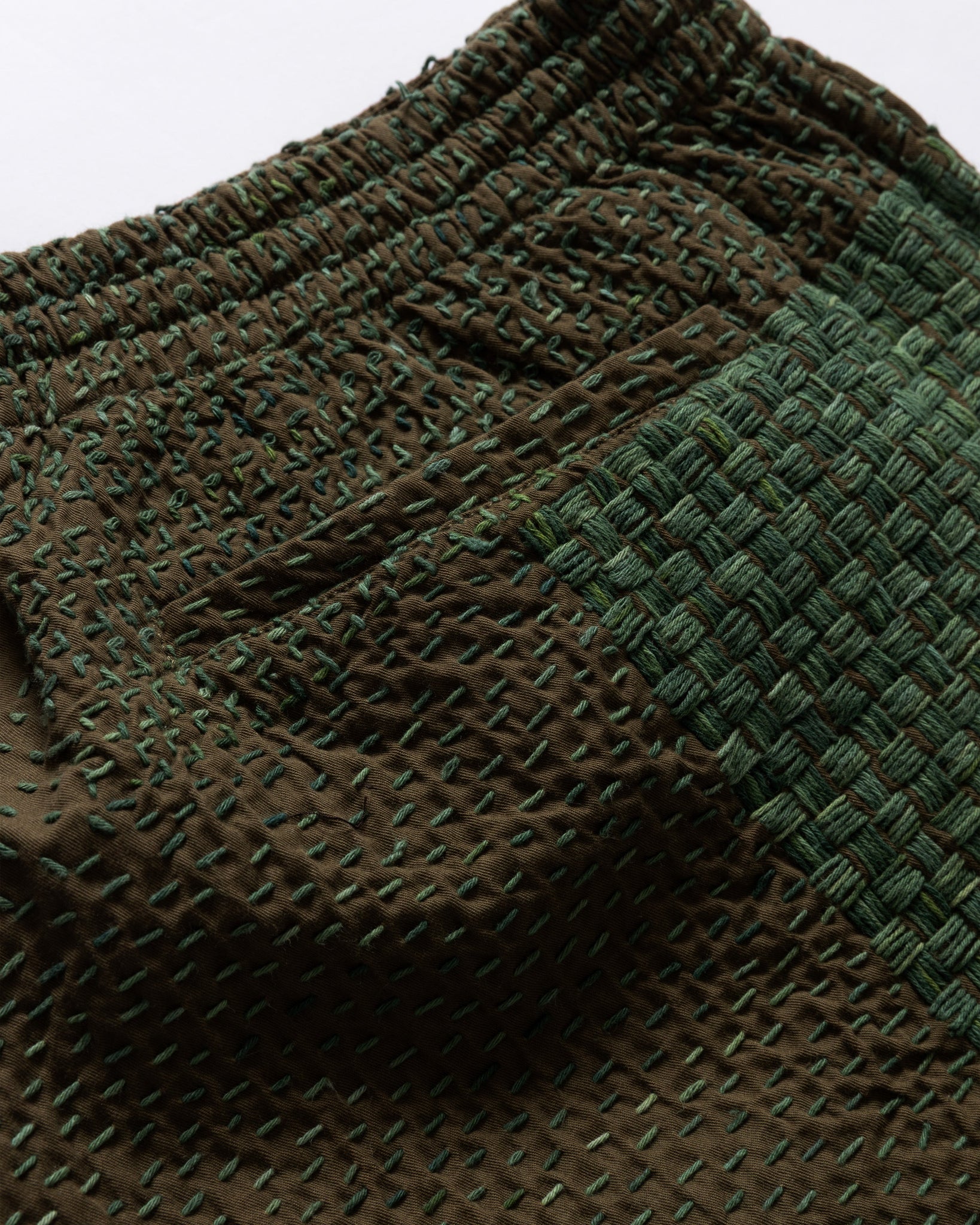 JAIPUR EASY SHORTS - OLIVE / "GRINDIGO" PATCHWORK KANTHA STITCHED COTTON CANVAS