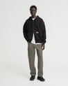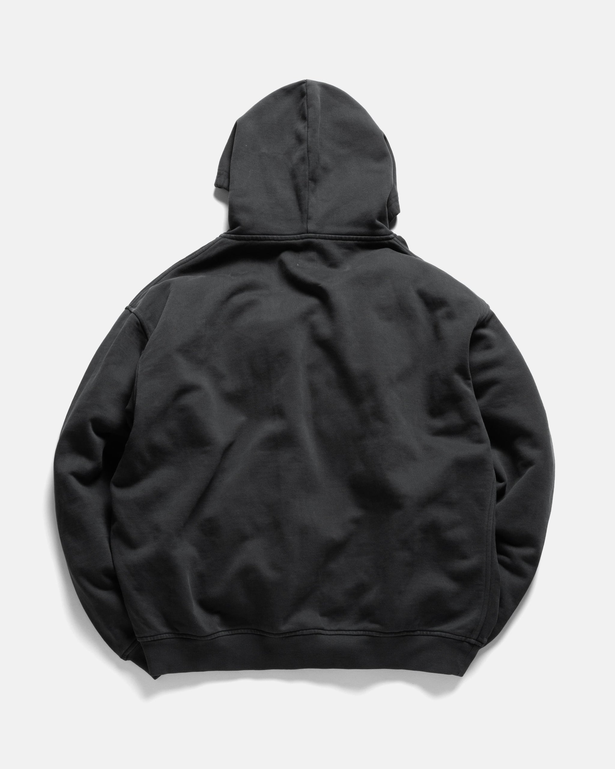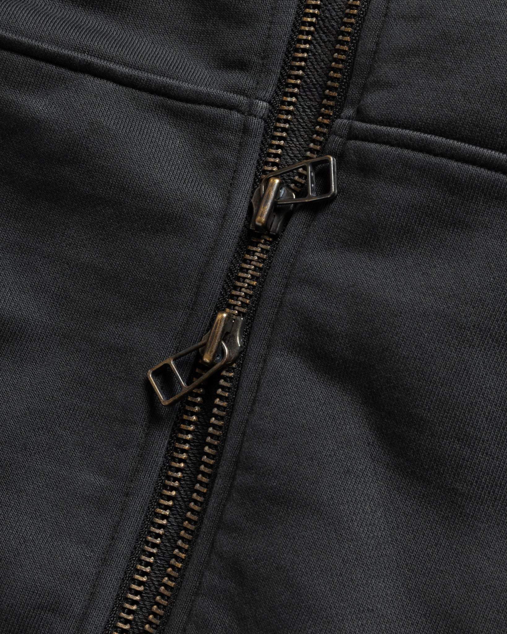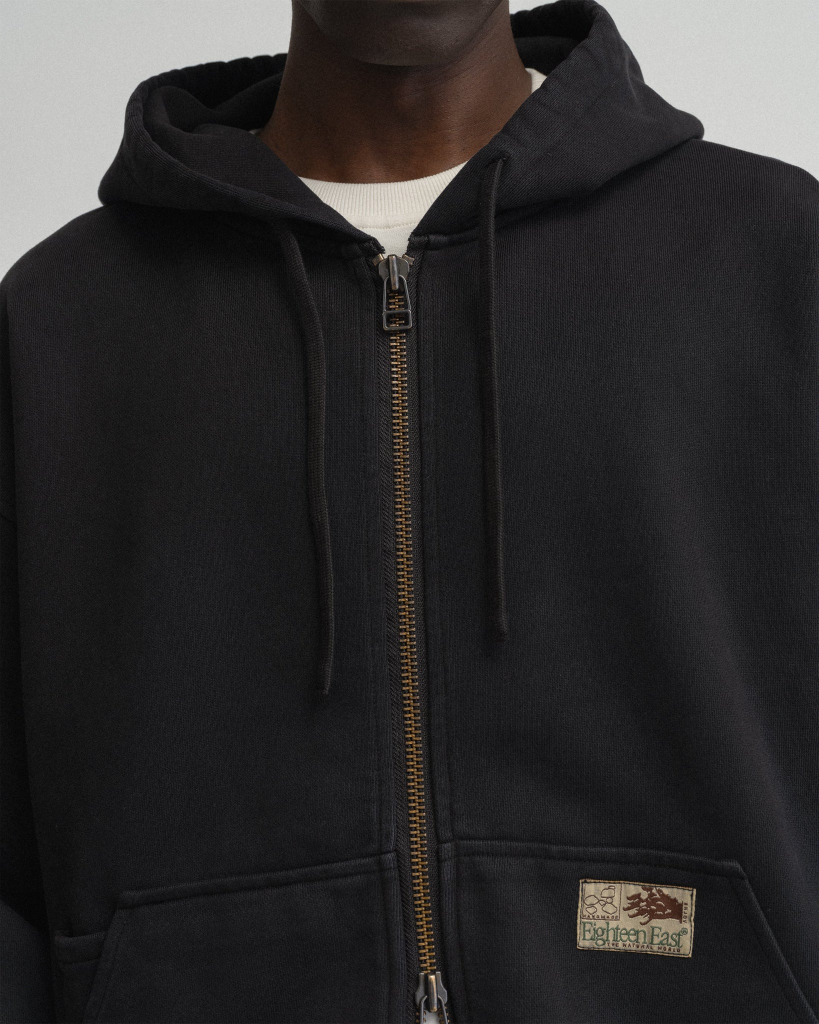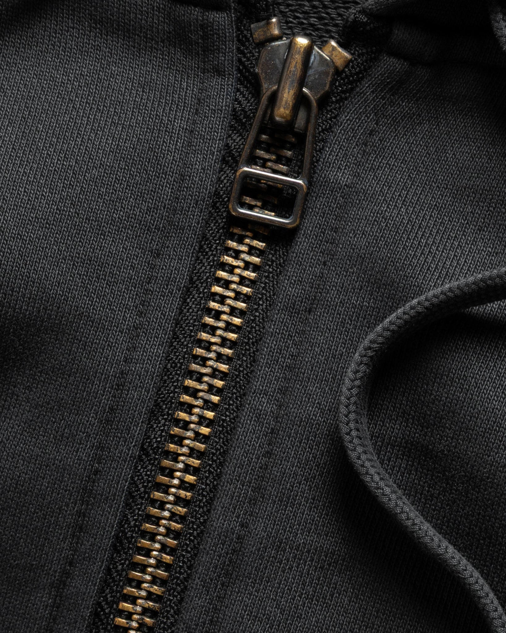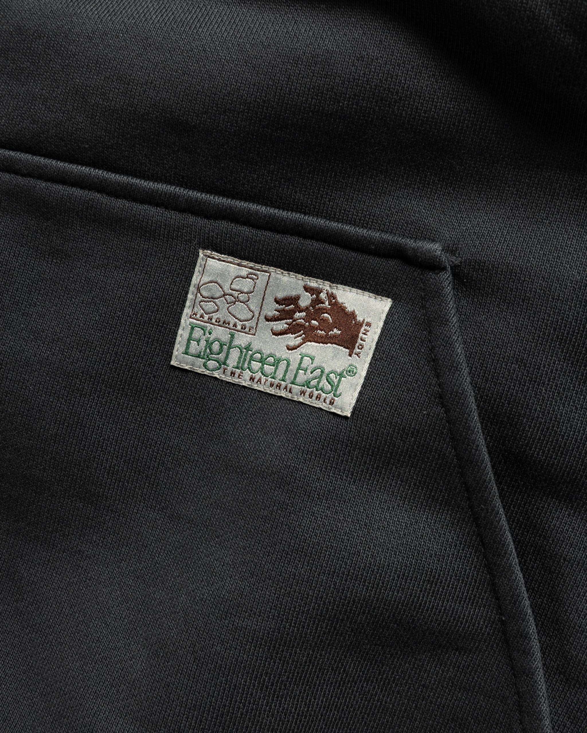 A good hooded sweatshirt with a 2 way zip is hard to find, so we made one.  The Tolmie is based on our Lugo sweatshirt, which has a properly sized hood, relaxed fit and set-in coin pocket behind the main kangaroo at the front.  This iteration has been hand screened with an exploded paisley print on the inside and then overdyed in black for a subtler finish.  It’s cut from a substantial 19 oz. all cotton fleece and features our “hands” label at the left pocket.