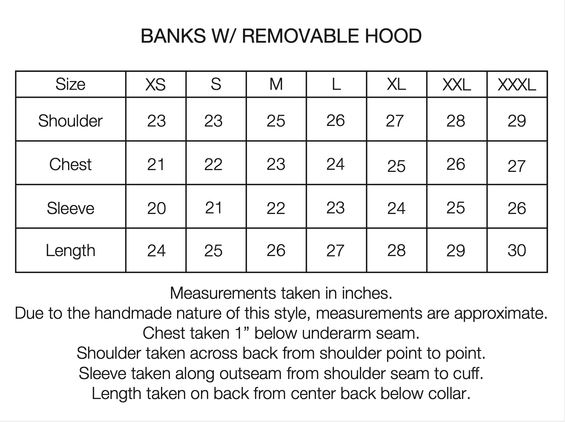 A perpetual team favorite, our newest iteration of the Banks jacket now features a streamlined but prolific pocket configuration and a zip-off, removable hood.  The best just got better.