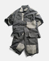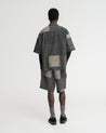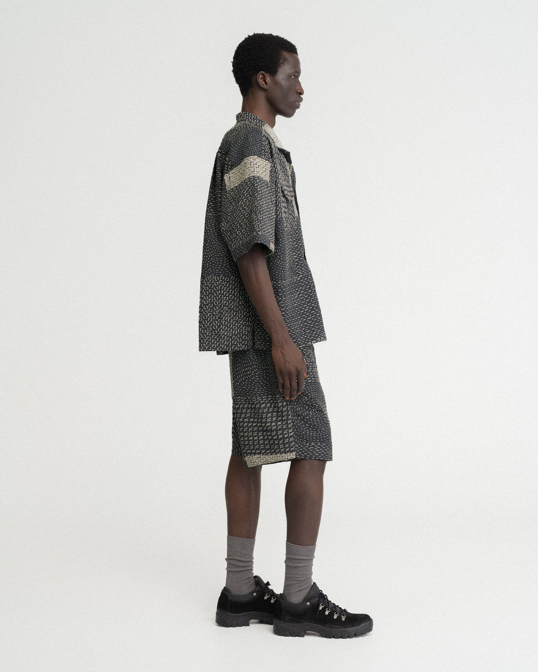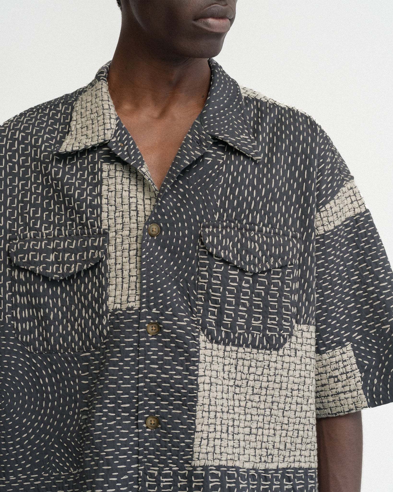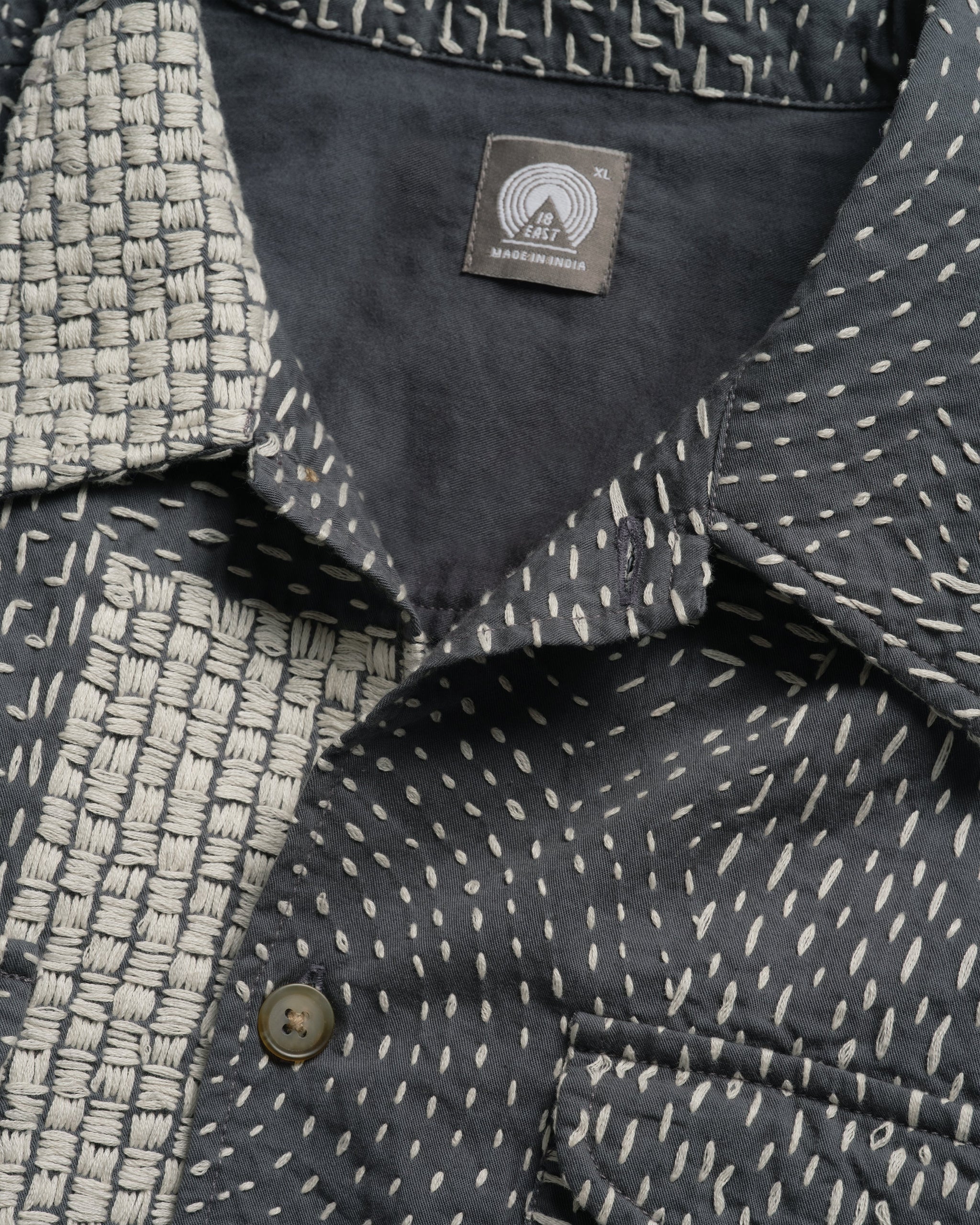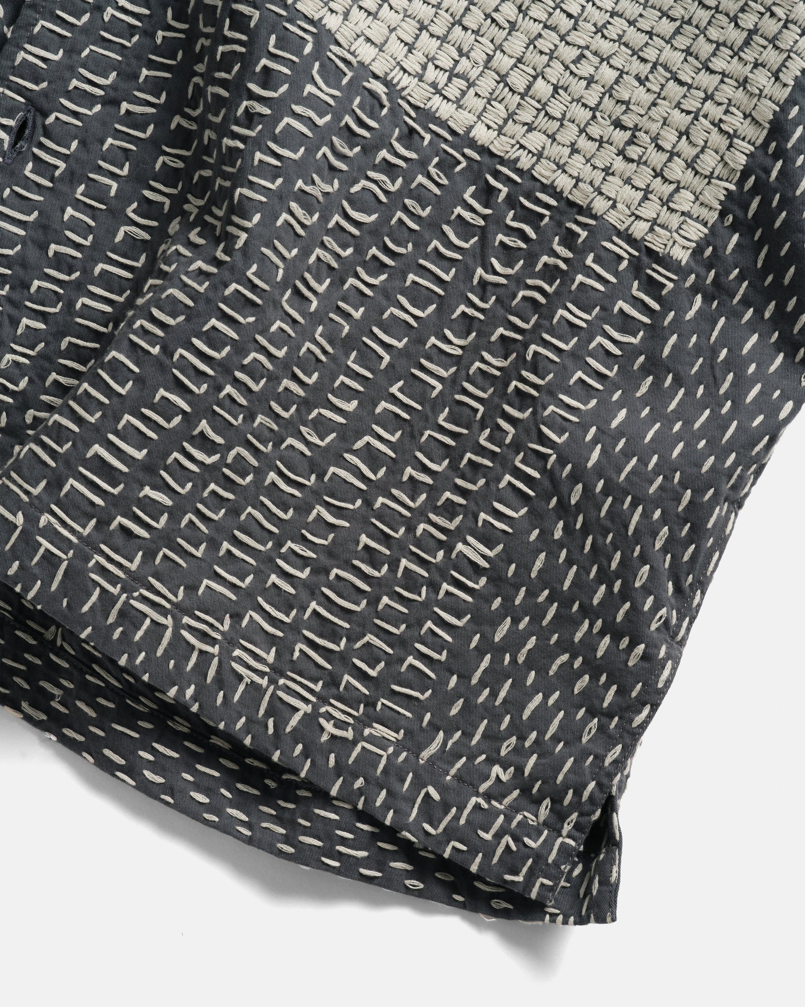 S/S WES SHIRT - WASHED SLATE/ECRU PATCHWORK KANTHA STITCHED COTTON CANVAS