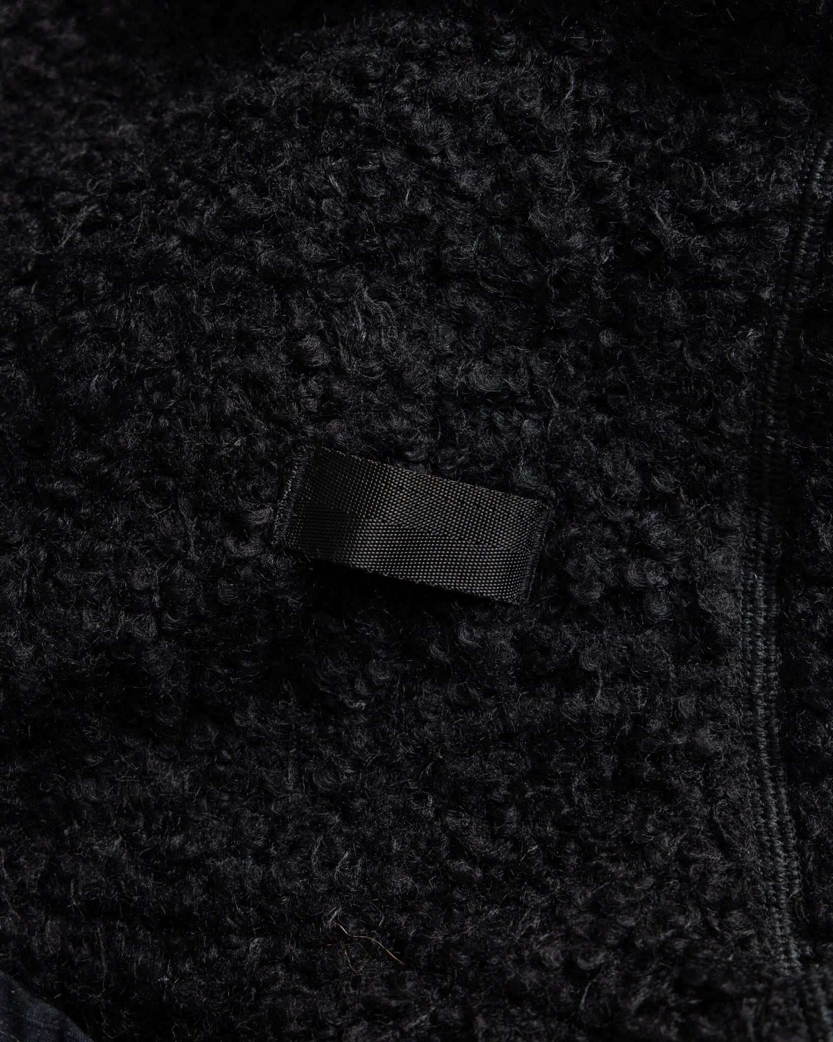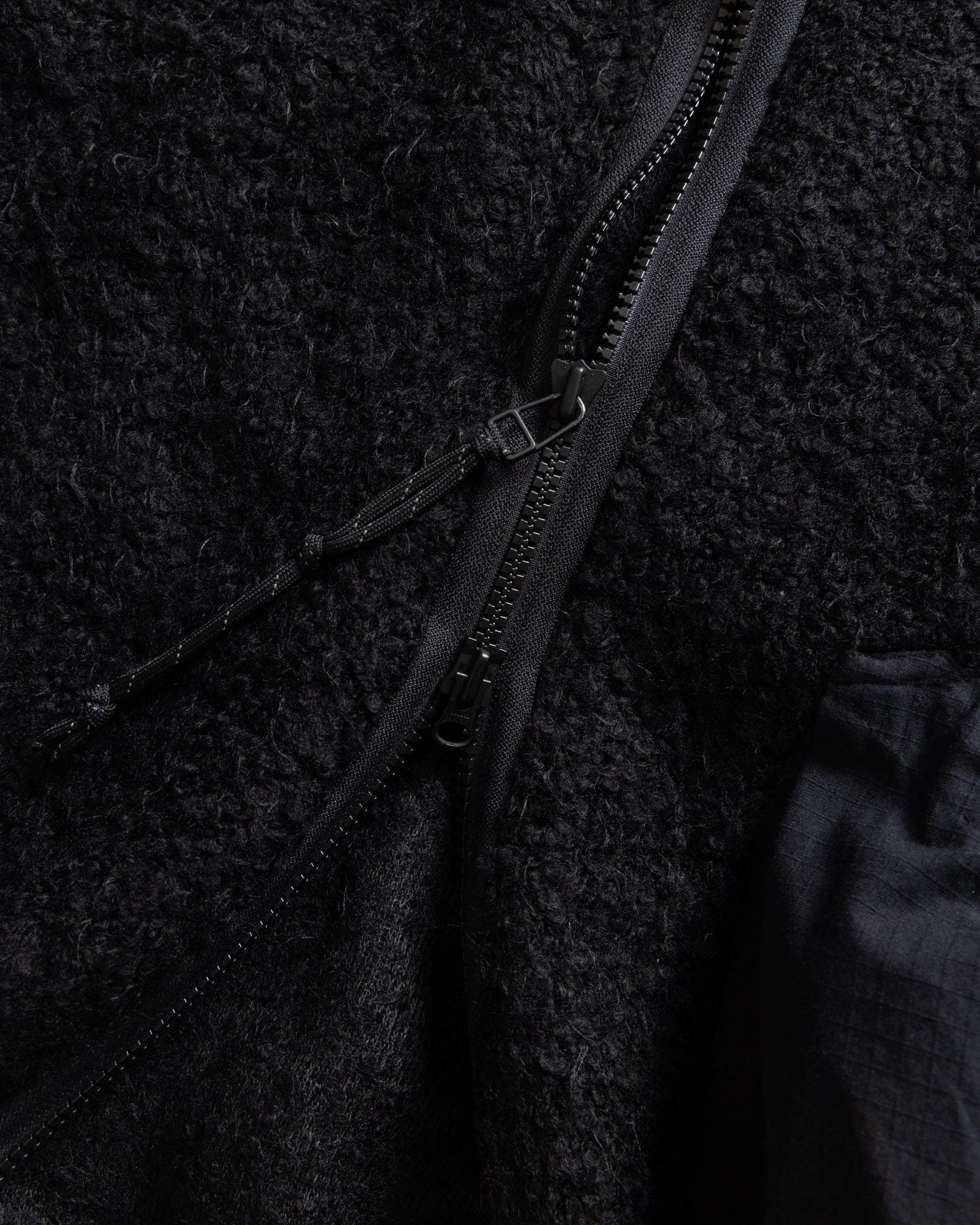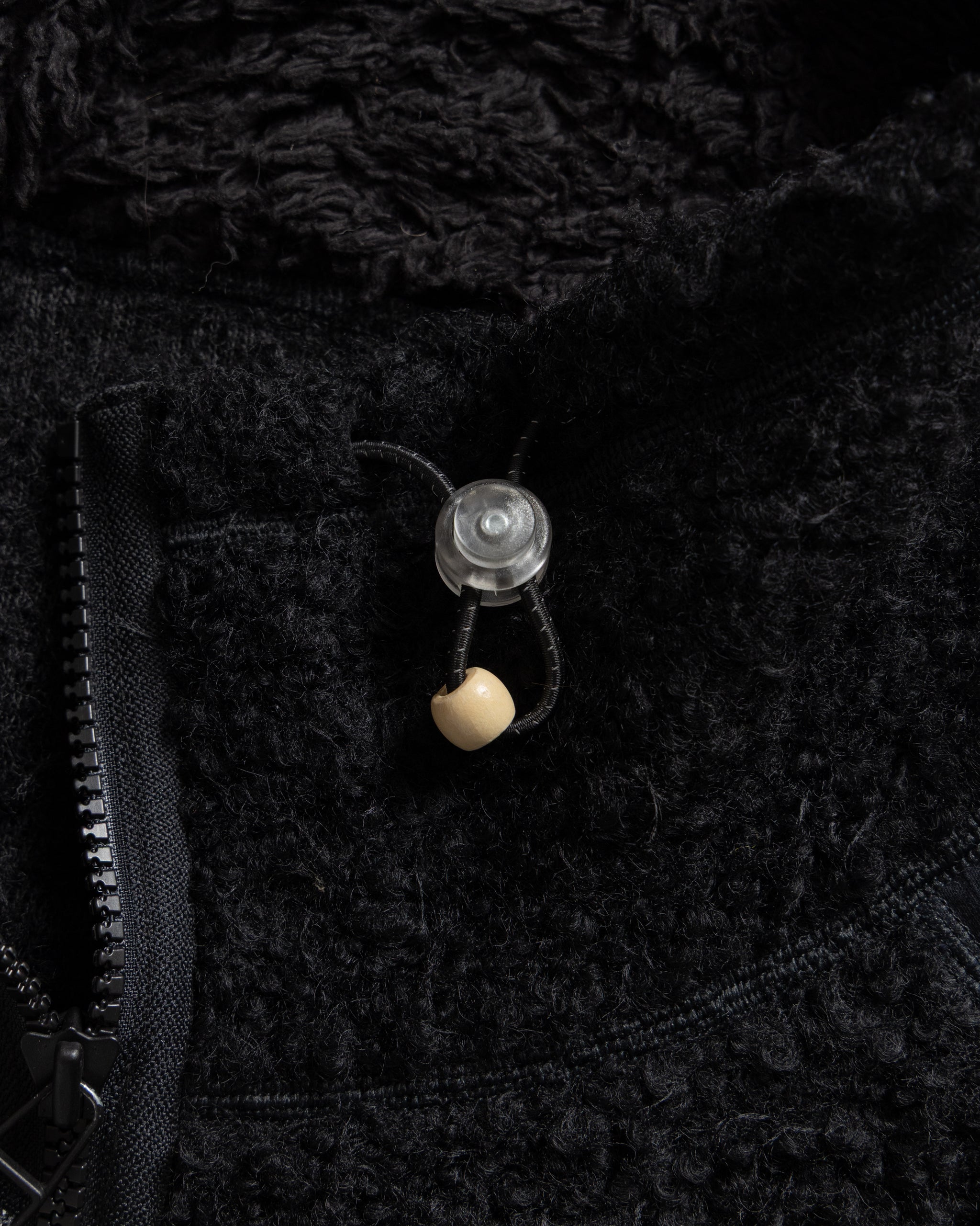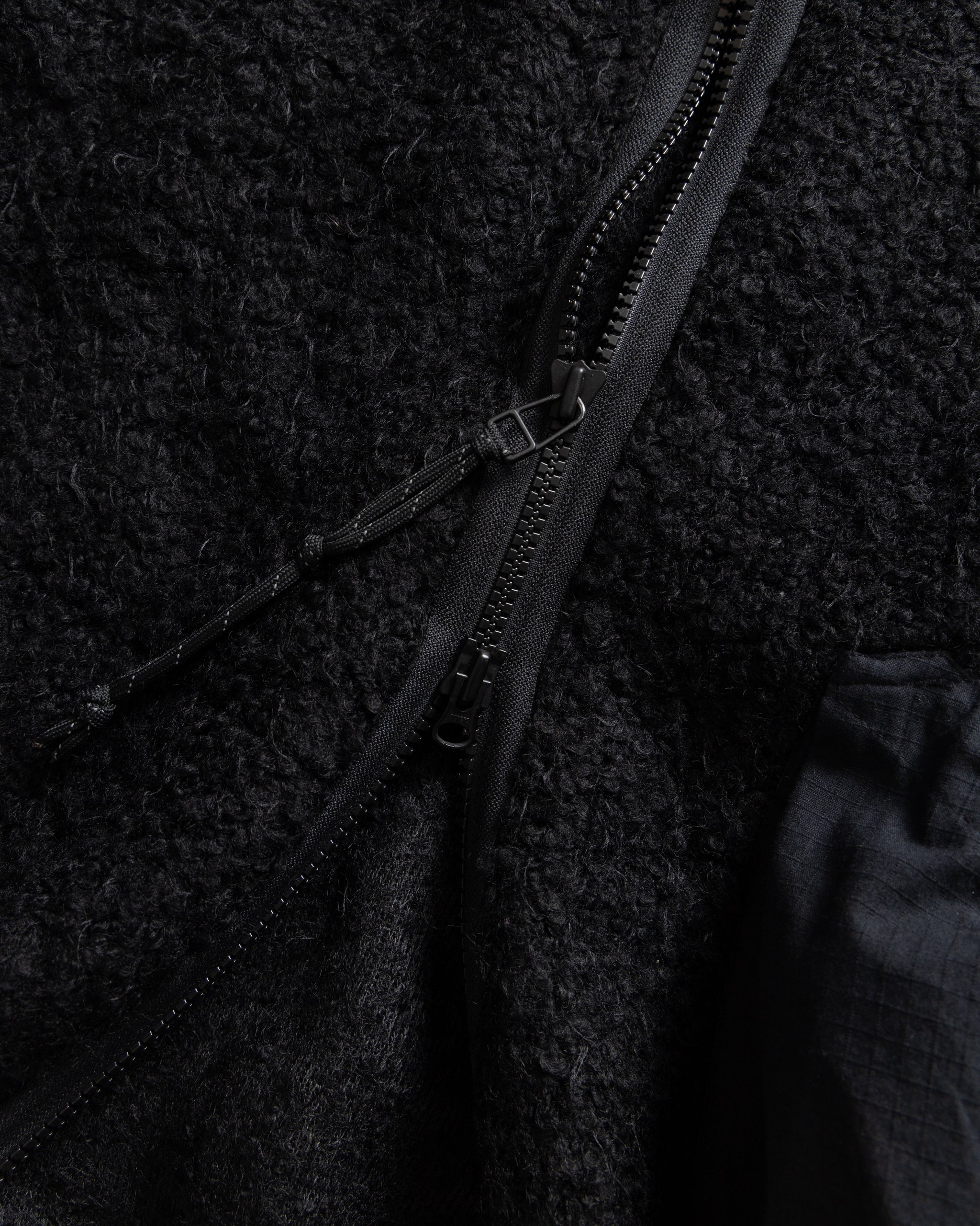 "This iteration of the Earth\Studies MS-110 ESCEP jacket is the product of extensive wear testing and it features a handful of small but substantial updates. We swapped the usual synthetic fleece base fabric with our black blended wool "fohair" boucle for increased warmth (though we lined the inside color in tonal black organic cotton deep pile for optimum comfort). The zip closure hip pocket has been adjusted to be fully side entry for ease of access and additional oversized zip cargo pockets have been added to the interior for gloves/hats/whatever. Thank you to Rob & Brandon for allowing us the opportunity to try and optimize an already nearly perfect jacket. Excited to wear this religiously." - The Management