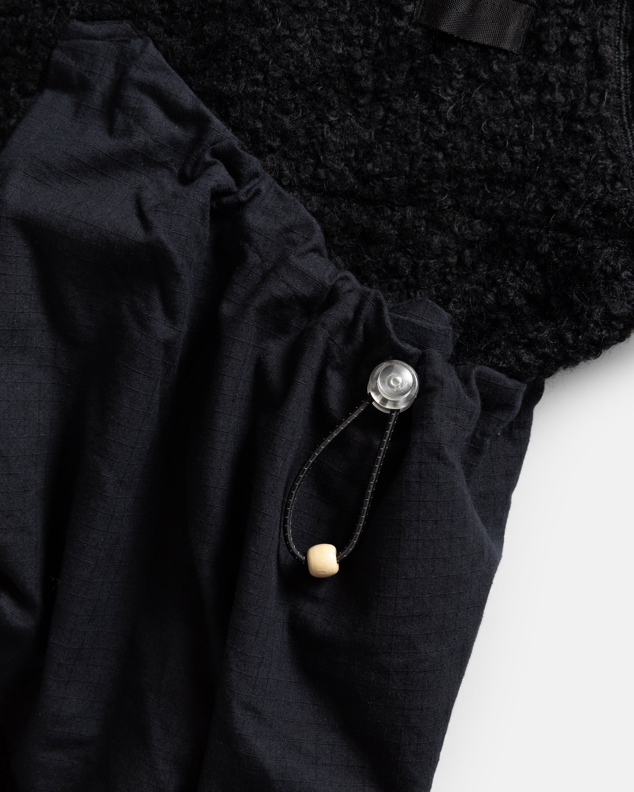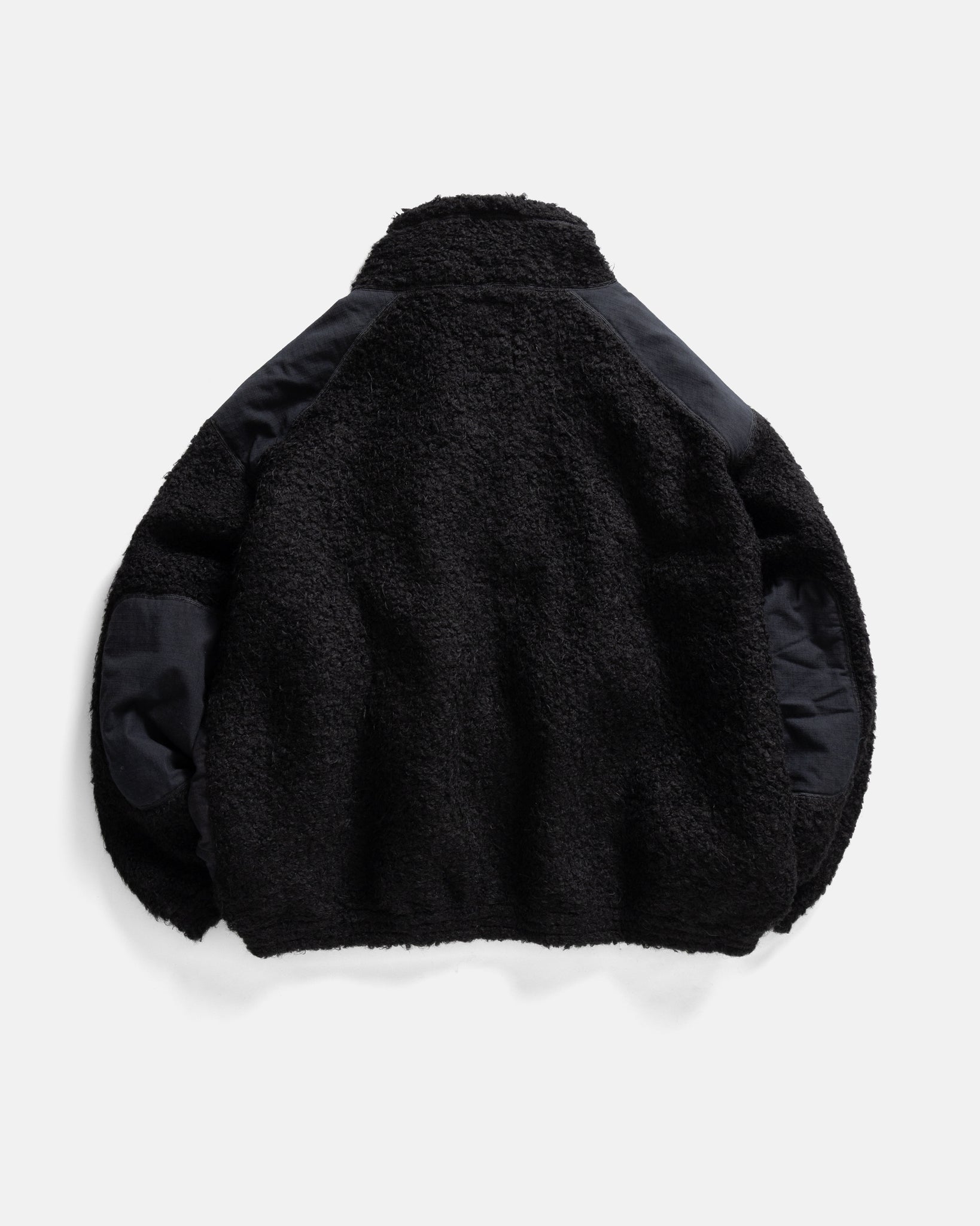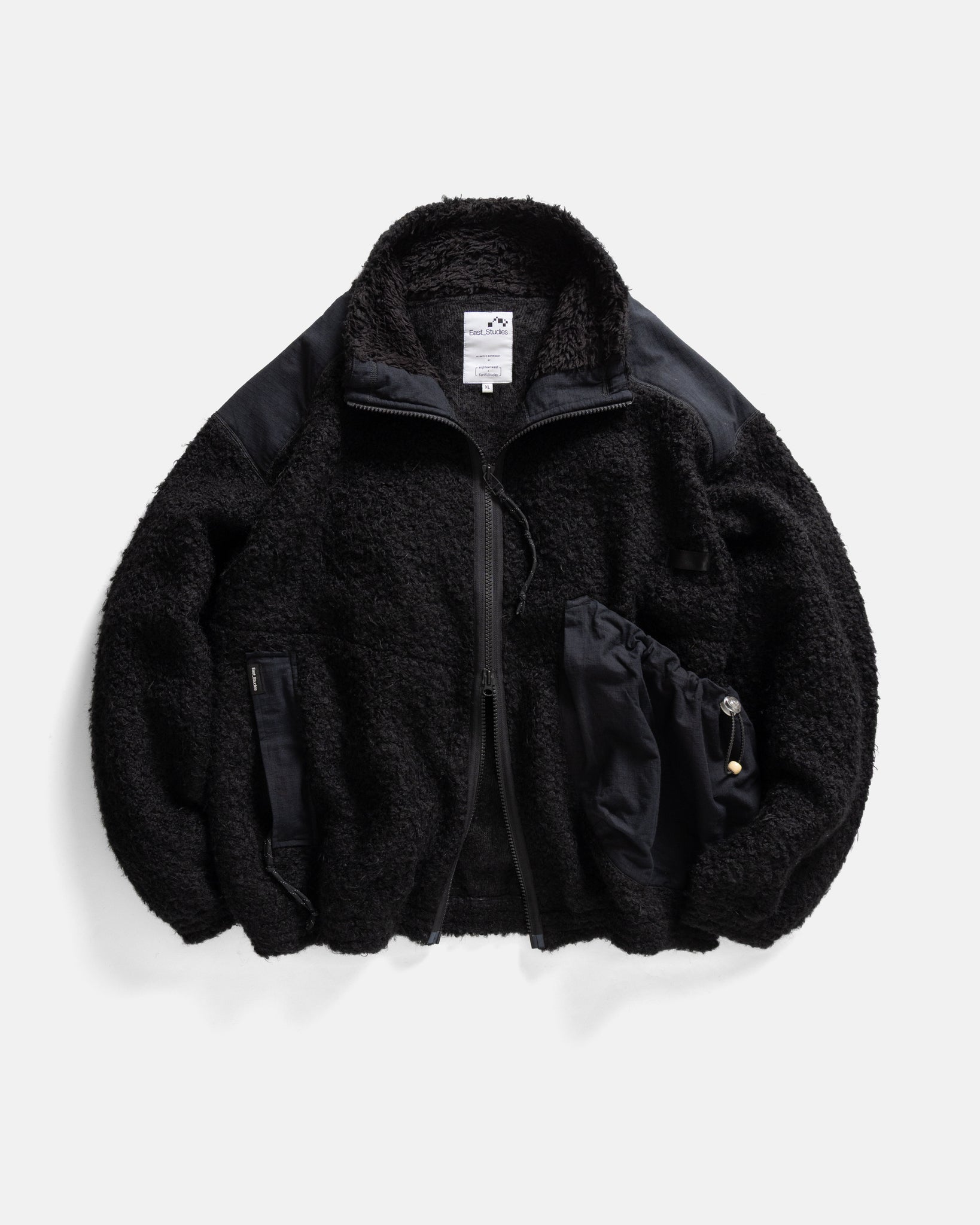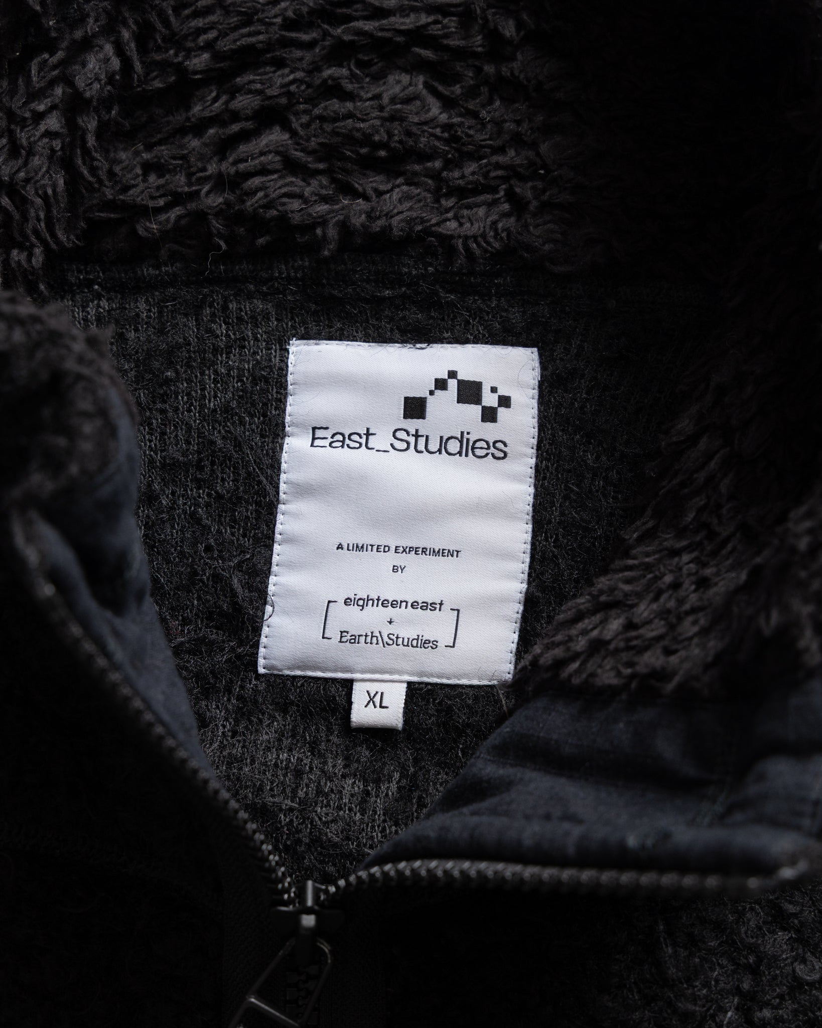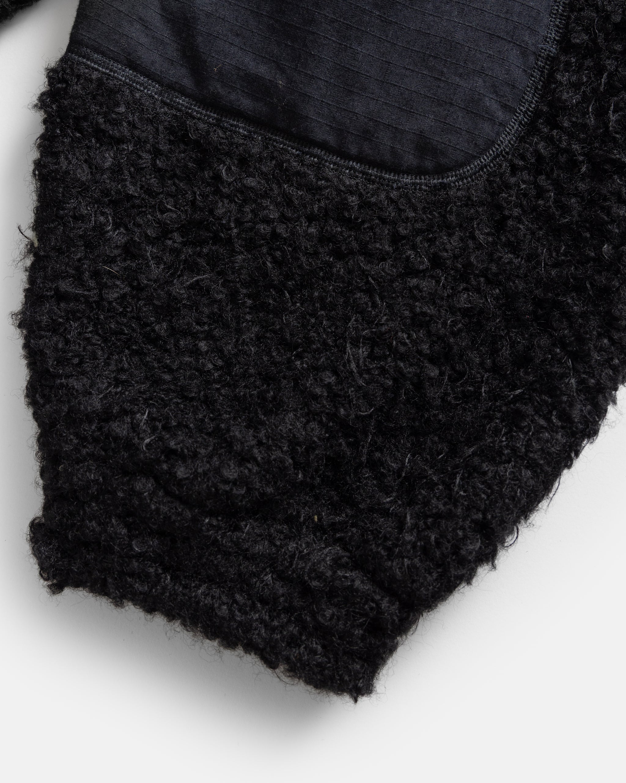 "This iteration of the Earth\Studies MS-110 ESCEP jacket is the product of extensive wear testing and it features a handful of small but substantial updates. We swapped the usual synthetic fleece base fabric with our black blended wool "fohair" boucle for increased warmth (though we lined the inside color in tonal black organic cotton deep pile for optimum comfort). The zip closure hip pocket has been adjusted to be fully side entry for ease of access and additional oversized zip cargo pockets have been added to the interior for gloves/hats/whatever. Thank you to Rob & Brandon for allowing us the opportunity to try and optimize an already nearly perfect jacket. Excited to wear this religiously." - The Management