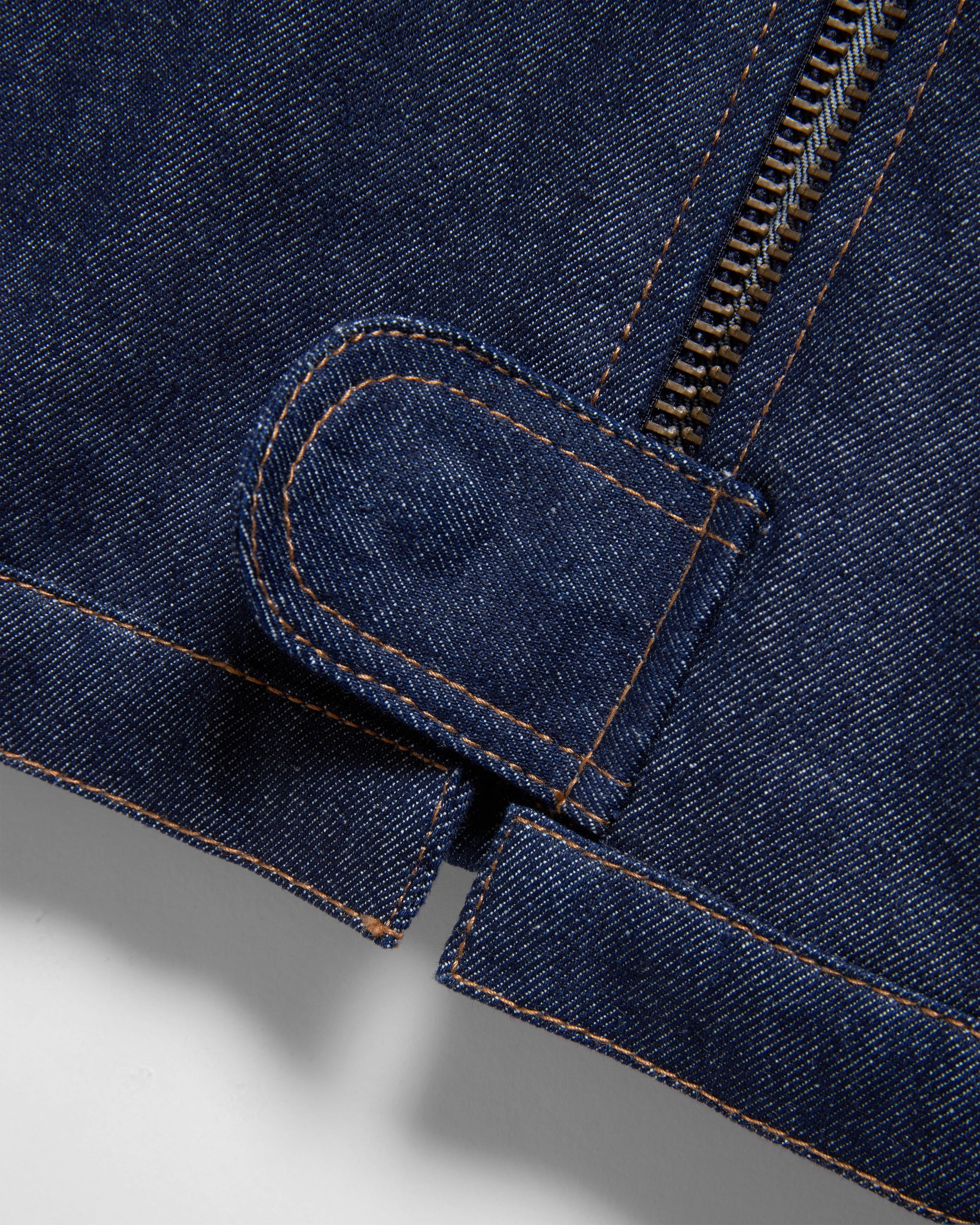 A jean jacket that's different from all the others. It features a heavy, 2-way antique brass zip front, snap latches at the neck and hem, ample pockets and an action back. Plus a really easy, relaxed fit.