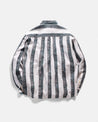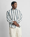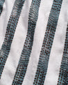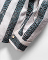 A genuinely handmade button-down that nods to the broad, striped awnings found on the sunfaded homes of New York's Shelter Island. It features tonally natural, 3 dimensional stripes woven directly into the cloth, hand block printed awning stripes on the back side (because that highlighted the irregularity of weave more beautifully) and "patchwork" hand embroidery on the face of those stripes in the same dusty brown as those beach houses.