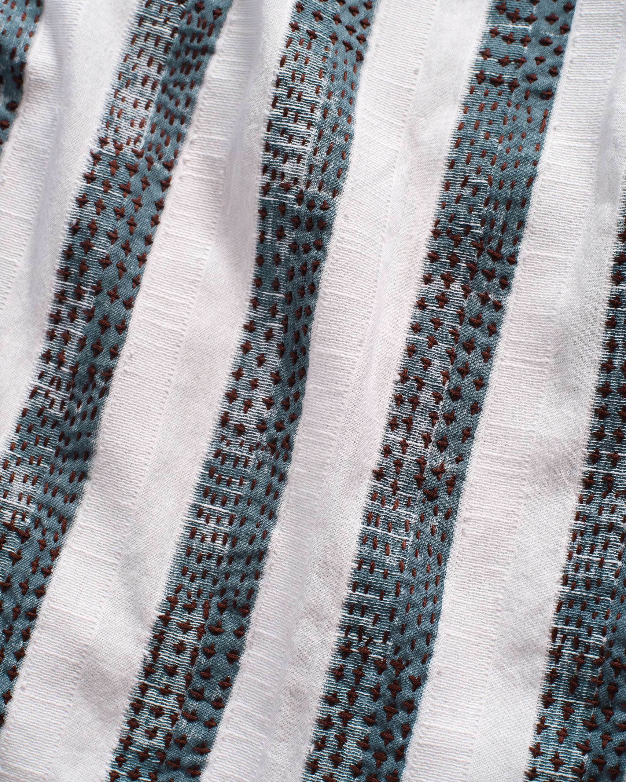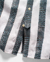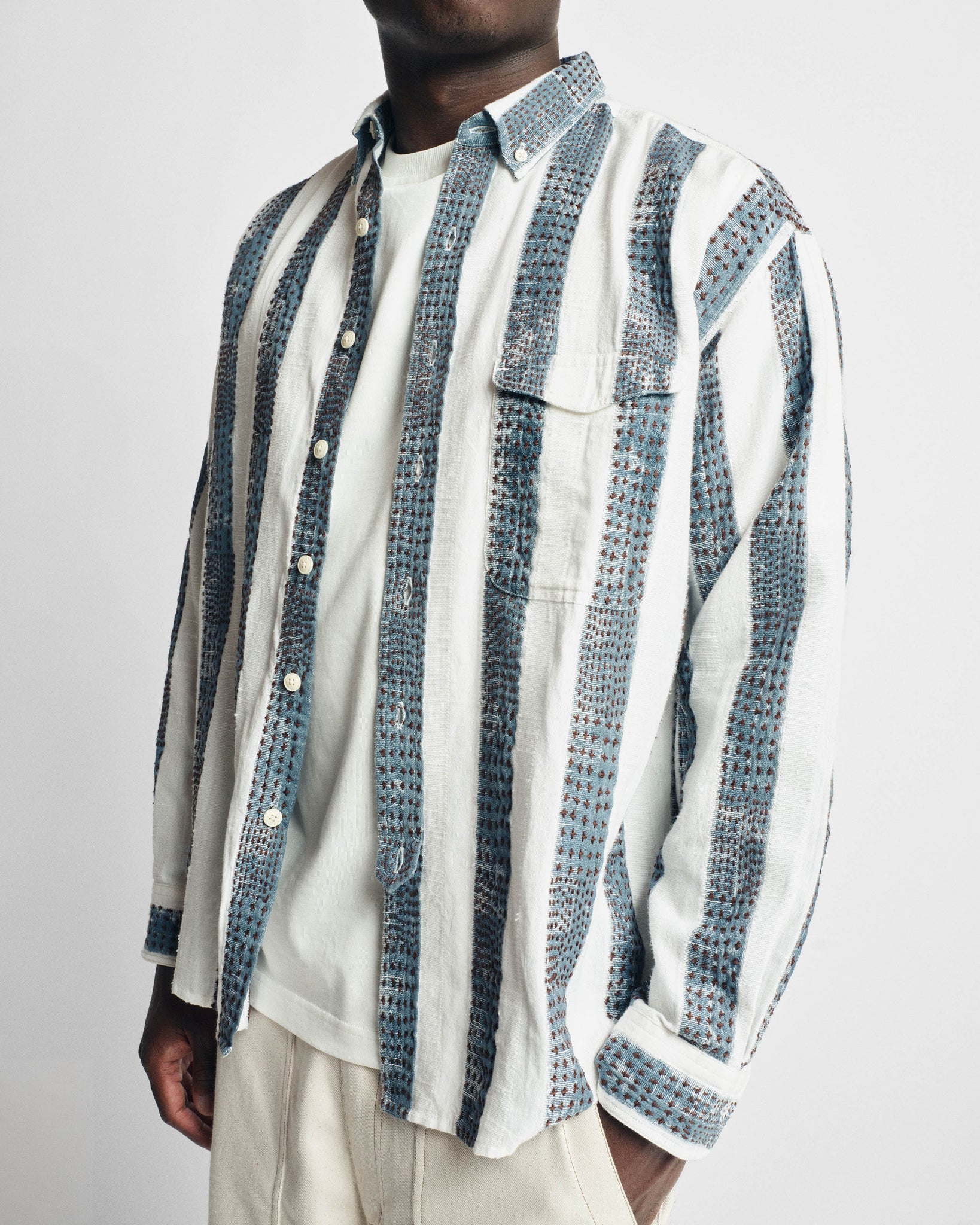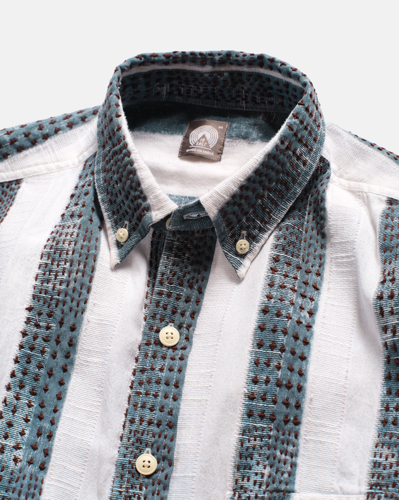 CHESTNUT BUTTON-DOWN SHIRT - NATURAL / INDIGO / CAFFE BLOCK PRINTED AND HAND EMBROIDERED JACQUARD STRIPE COTTON