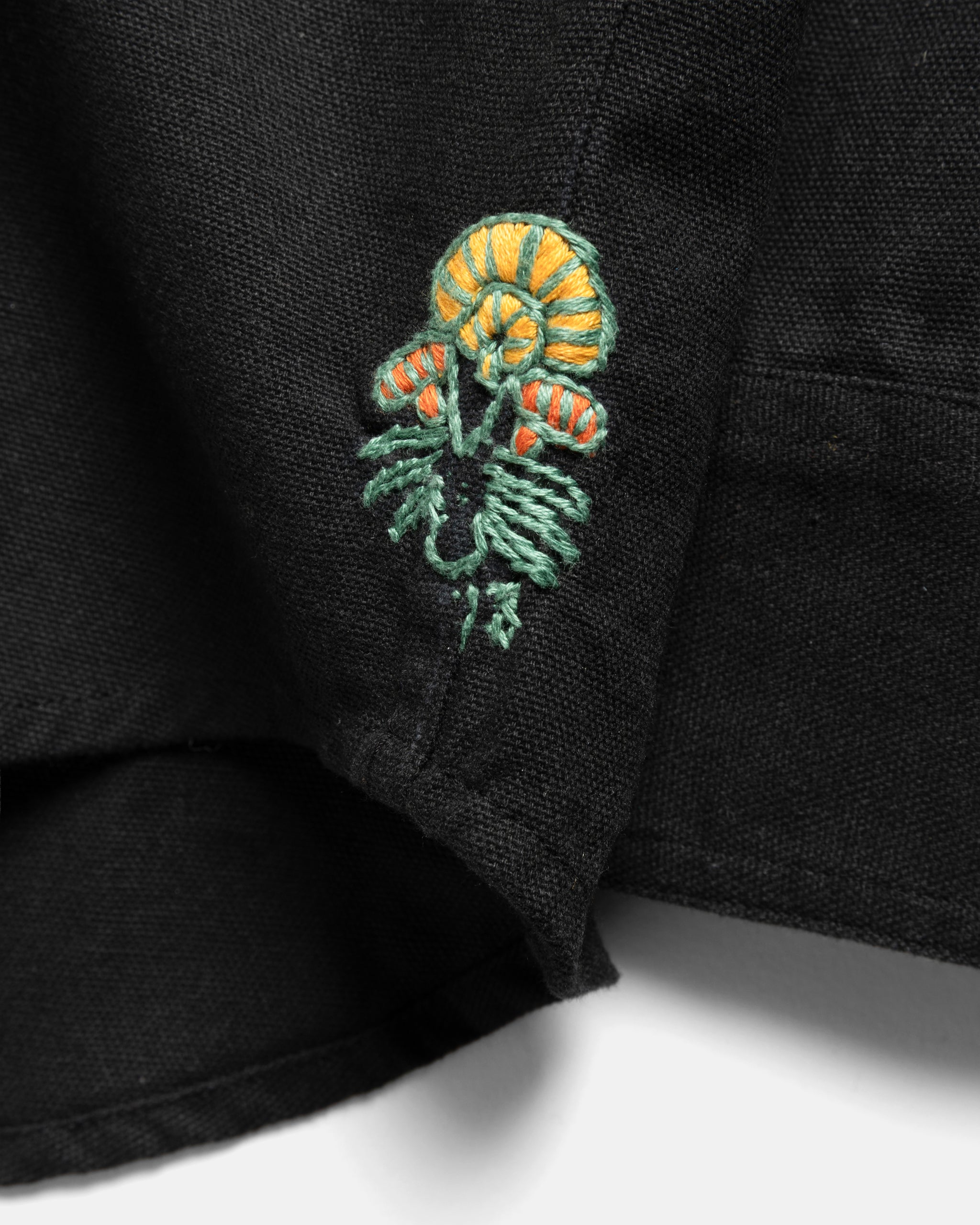 Our very first button-down shirt model, with a smaller (and some might say less fussy) collar and tri-color hand-embroidered Indian "Bhuti" flower at the left side seam, to show that we make these pieces overseas for craft and beauty's sake.