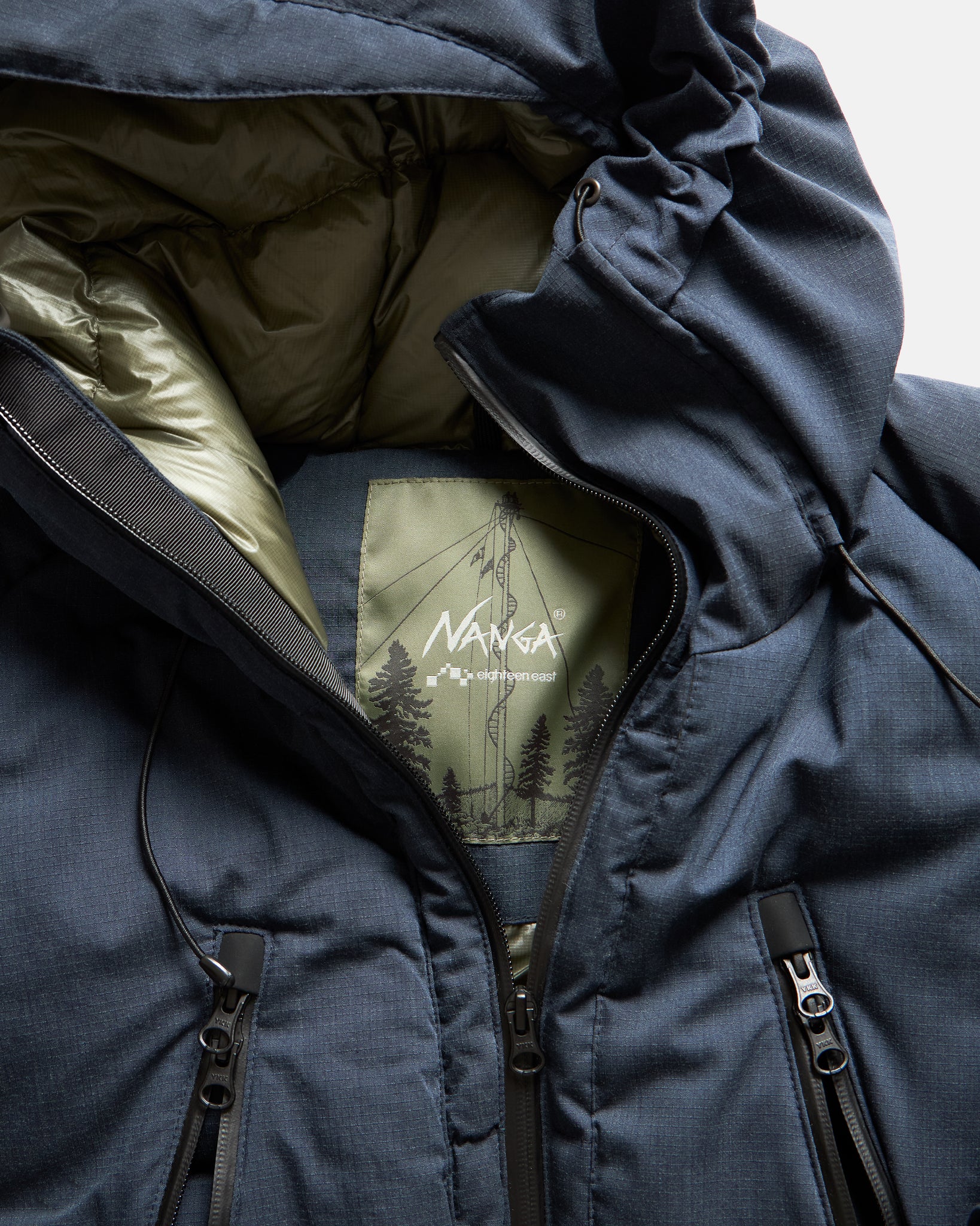 18 EAST / NANGA HOODED LOOKOUT DOWN JACKET - NAVY MELANGE HINOC / OD GREEN 15DN RIPSTOP NYLON